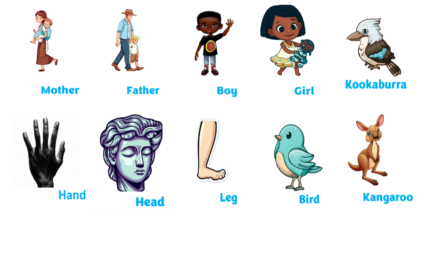 Language is all about the world around us, the people, the animals, and the objects. Building your language skills in the beginning is all about the vocabulary for these everyday objects. Here’s ten words to keep going with: Mother, Father, Boy, Girl, Kookaburra, Ant, Head, Leg, Bird, Kangaroo.